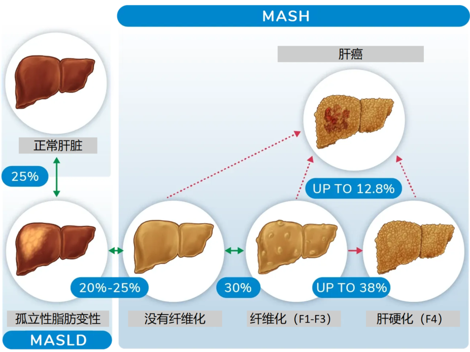 MASLD疾病譜包括單純性脂肪肝(MAFL)、脂肪性肝炎(MASH)及其相關(guān)纖維化和肝硬化。隨著肥胖和2型糖尿病(T2DM)的流行,全球MASLD患病率和發(fā)病率不斷增高。據(jù)報道,全球MASLD的發(fā)病率約20-35%,其中約10-30%的患者患有MASH。