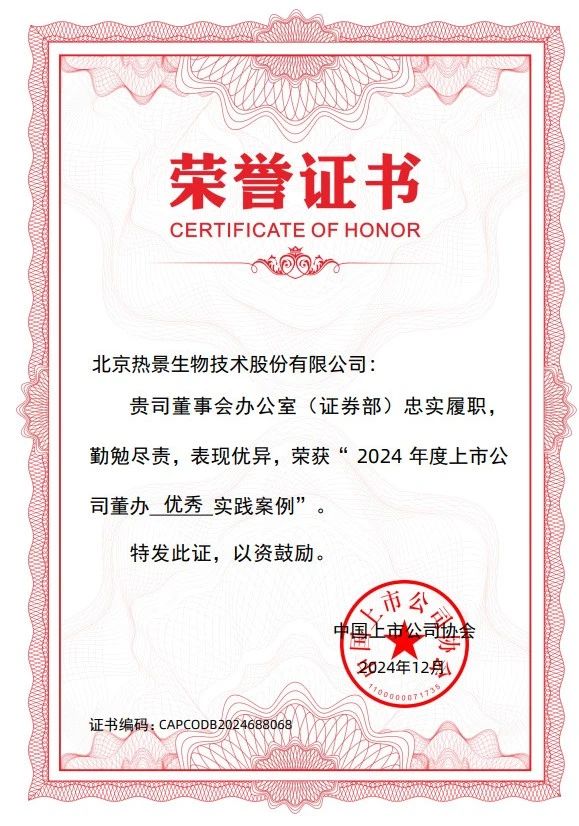 近日,中國上市公司協會開展的“上市公司董辦最佳實踐案例征集活動”結果揭曉,熱景生物榮獲“2024年度上市公司董辦優秀實踐案例”,這也是公司連續第三年獲此榮譽。 “上市公司董辦最佳實踐”案例征集活動是中國上市公司協會對上市公司董事會辦公室履職情況進行評價,評價體系涵蓋了上市公司董辦工作所涉及的信息披露管理事務、公司治理機制建設、投資者關系管理事務等指標,于今年10月啟動,經初審、專家委員會評審、誠信核查等環節,最終評出最佳實踐案例280家、優秀實踐案例300家。其中入選“董辦優秀實踐案例”的300家上市公司中,滬市上市公司150家,占50%;深市上市公司146家,占48.7%;北交所上市公司4家。