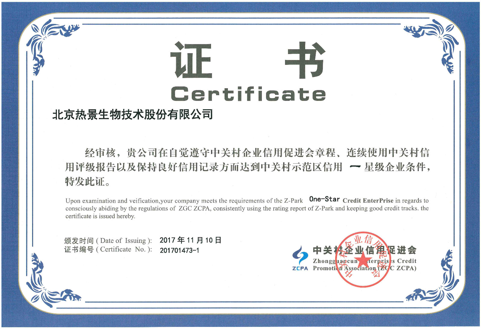 中關(guān)村信用促進會信用星級評定證書一星級
